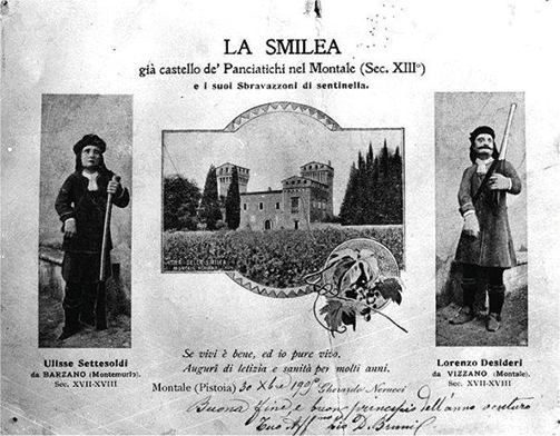 Circa un secolo fa, chi fosse passato da via Garibaldi, che allora si chiamava Strada dei Cancelli, giunto all’altezza di Villa Smilea, ai lati del portone d’ingresso avrebbe visto “a mo” di sentinelle e armate d’archibugio e di spada a tracolla, due figure di pietra al naturale e colorate a olio.” Rappresentavano Lorenzo Desideri, detto Vizzano dal luogo dove abitava a Montale e Ulisse Settesoldi, detto Barzano da dove abitava a Montemurlo. Il Manzoni nei suoi Promessi sposi li avrebbe chiamati bravi, Gherardo Nerucci, che ce ne racconta le gesta fatte di ruberie, soprusi e perfino di omicidi, li chiama “sbravazzoni”.