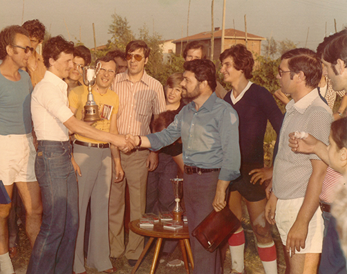 Nei suoi ricordi quello è stato l’anno magico della sua carriera, per due motivi. Primo perché debuttò in Coppa Italia contro l’Aquila Montevarchi, avendo al suo fianco un allenatore del calibro di Bruno Cappellini, altra gloria quarratina. Poi perché il giovanissimo atleta ebbe l’opportunità di affrontare la Nazionale di Ferruccio Valcareggi in preparazione per i Mondiali del Messico. Infatti all’epoca era usanza per gli Azzurri disputare delle amichevoli di allenamento con squadre locali e una di queste avvenne proprio a Pistoia. Noi possiamo solo immaginare l’emozione di un adolescente convocato in partita per affrontare campioni del calibro di Gigi Riva, Gianni Rivera e Sandro Mazzola (formazione della Pistoiese, nella foto in bianco e nero).